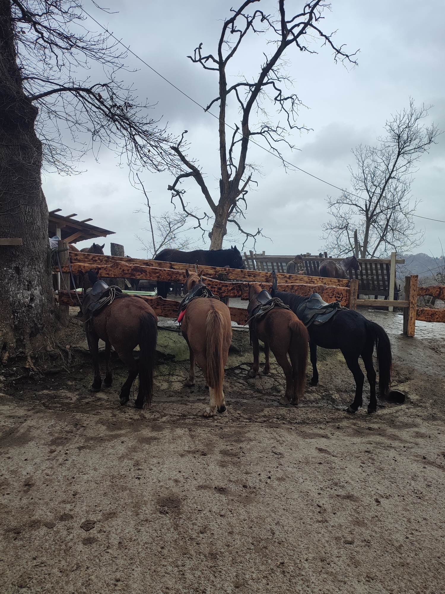 The image depicts an outdoor scene in Bestuzhevskoye, Russia, under an overcast sky. In the foreground, a muddy dirt ground covers the lower half of the frame. Five horses are visible, primarily from their rear or side. Two saddled horses stand prominently in the immediate foreground, facing away from the viewer; one is light brown/chestnut with a red accessory near its head, and the other is dark brown/black. Another saddled dark brown/black horse stands to the right, facing right. Two additional brown horses are partially visible behind these, also saddled. Further in the midground, a rustic wooden fence constructed from debarked logs extends horizontally. Behind this fence, more horses are present. To the far left, a large, thick tree trunk with textured bark and possibly vines stands beside a simple wooden lean-to shelter with a corrugated roof. A lone individual is partially visible behind the fence, positioned between two horses near the lean-to. The upper portion of the image is dominated by several large, bare deciduous trees with intricate, twisted branches silhouetted against a uniformly grey, cloudy sky. Distant hills or mountains are faintly visible in the background.