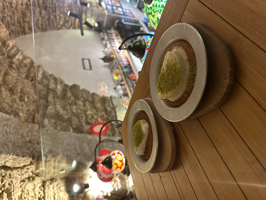 Two plates of künefe, a traditional Middle Eastern dessert with cheese and semolina dough, are placed on a wooden surface. Each is topped with a dollop of white cream and a sprinkle of green pistachios. A reflection of the interior setting is seen through a transparent barrier, revealing a stone-walled room, decorative lamps, and possibly a shop display with colorful glass ornaments. The scene captures a blend of culinary delight and unique cultural ambiance.