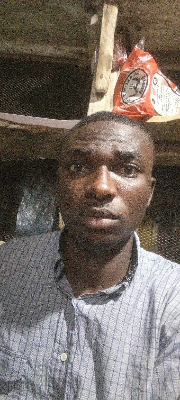 A man with short dark hair and brown eyes looks directly at the camera. He wears a light blue plaid button-down shirt. Behind him is a cluttered shelf with a wooden support and a red and white bag with a logo and text. A wire mesh panel is visible in the background.