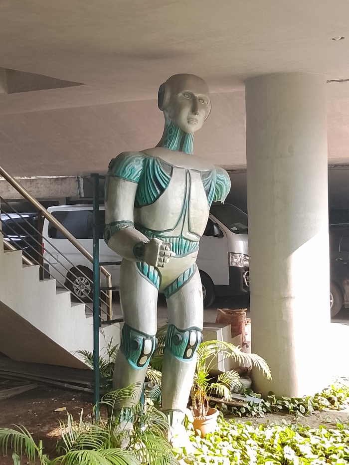 A life-sized statue of a humanoid robot stands indoors