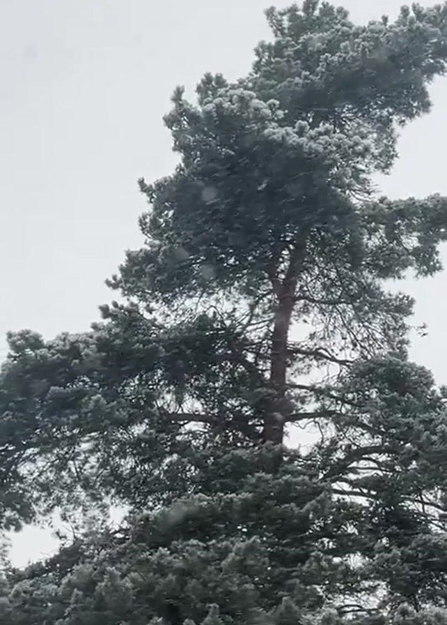 A video shows a tall pine tree during a light snowfall