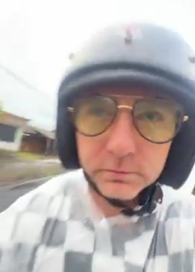 A person with light skin and a light beard, wearing sunglasses, a helmet and a clear rain jacket rides a turquoise motorcycle along a paved road. The person looks at the camera periodically. The background shows buildings, foliage, cars, and other people. The sky is overcast.