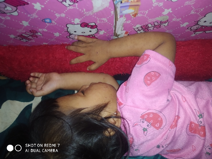 - "An image captured indoors depicts a young child, appearing to be asleep, lying on their right side" by FM-kh49F3, licensed under CC BY 4.0