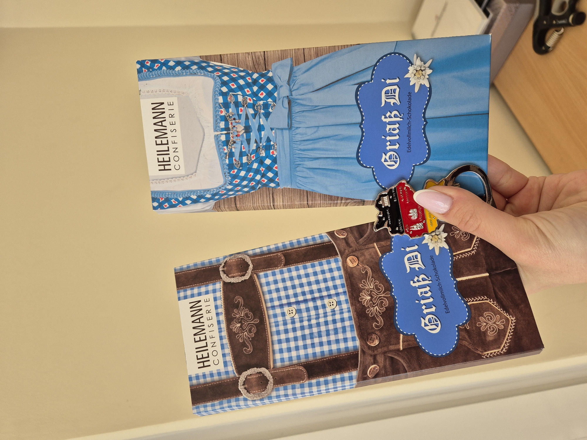 The image displays two HEILEMANN CONFISERIE chocolate bar packages held by a human right hand. The hand exhibits manicured fingernails with a light pink base and white tips. A metal keychain featuring the German flag colors and city names (e.g., Hamburg, Berlin, Dresden, Leipzig, Frankfurt, München) is held by the fingers, positioned near the packages. The left chocolate package is designed to resemble Bavarian lederhosen with a blue and white checkered shirt, brown suspenders, and brown shorts. The right package depicts a blue and white Bavarian dirndl dress. Both packages feature the text "Griaß Di" and "Edelvollmilch-Schokolade" on a blue, cloud-shaped label, accompanied by an edelweiss flower illustration. The background consists of a plain, light beige-colored wall. In the lower right portion of the image, a light-colored wooden surface is partially visible. On this surface, a section of a dark, spring-loaded hand grip exerciser and a dark box are discernible. The specific location within the city of Varna, Bulgaria, cannot be determined from the visual evidence present in the image.