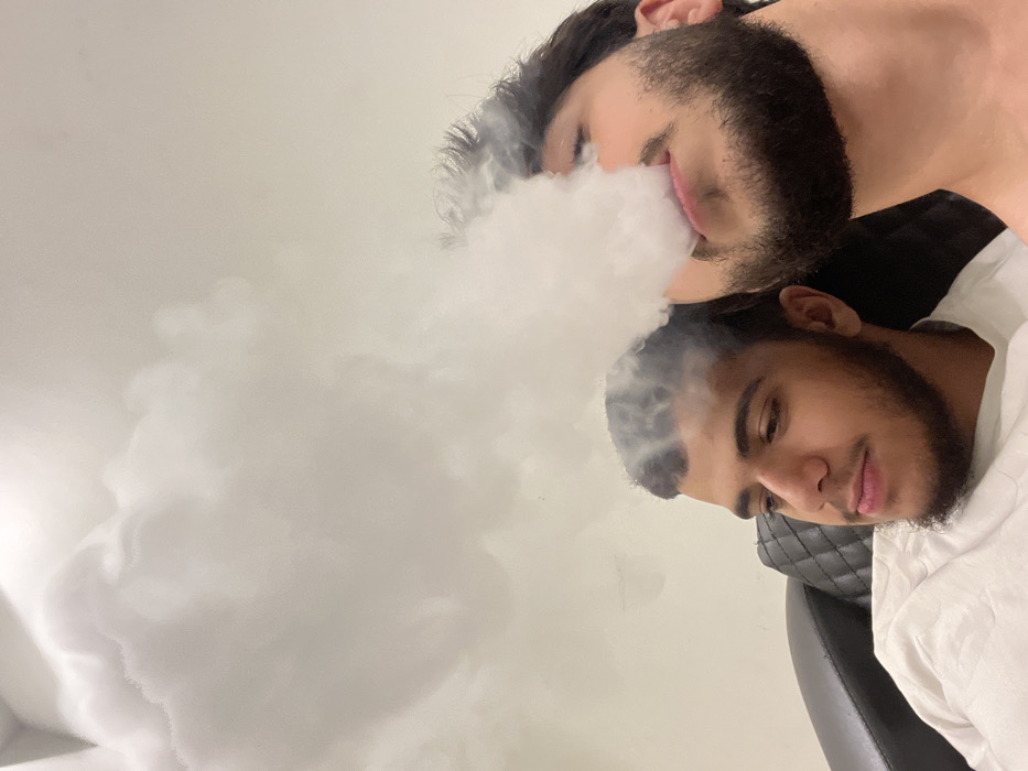 An indoor scene in Al-Qanawat Municipality, Syria, depicts two young adult males in close proximity. In the foreground on the right, a male with dark hair and a beard, appearing shirtless, is actively exhaling a dense plume of white vapor from his mouth, which disperses upwards and to the left, dominating the upper central portion of the frame. To his left and slightly behind, a second male with dark hair and a beard is visible, wearing a white t-shirt and seated in a dark, possibly quilted leather chair. He is looking towards the right, observing the first male. The background consists of a plain, light-colored wall.