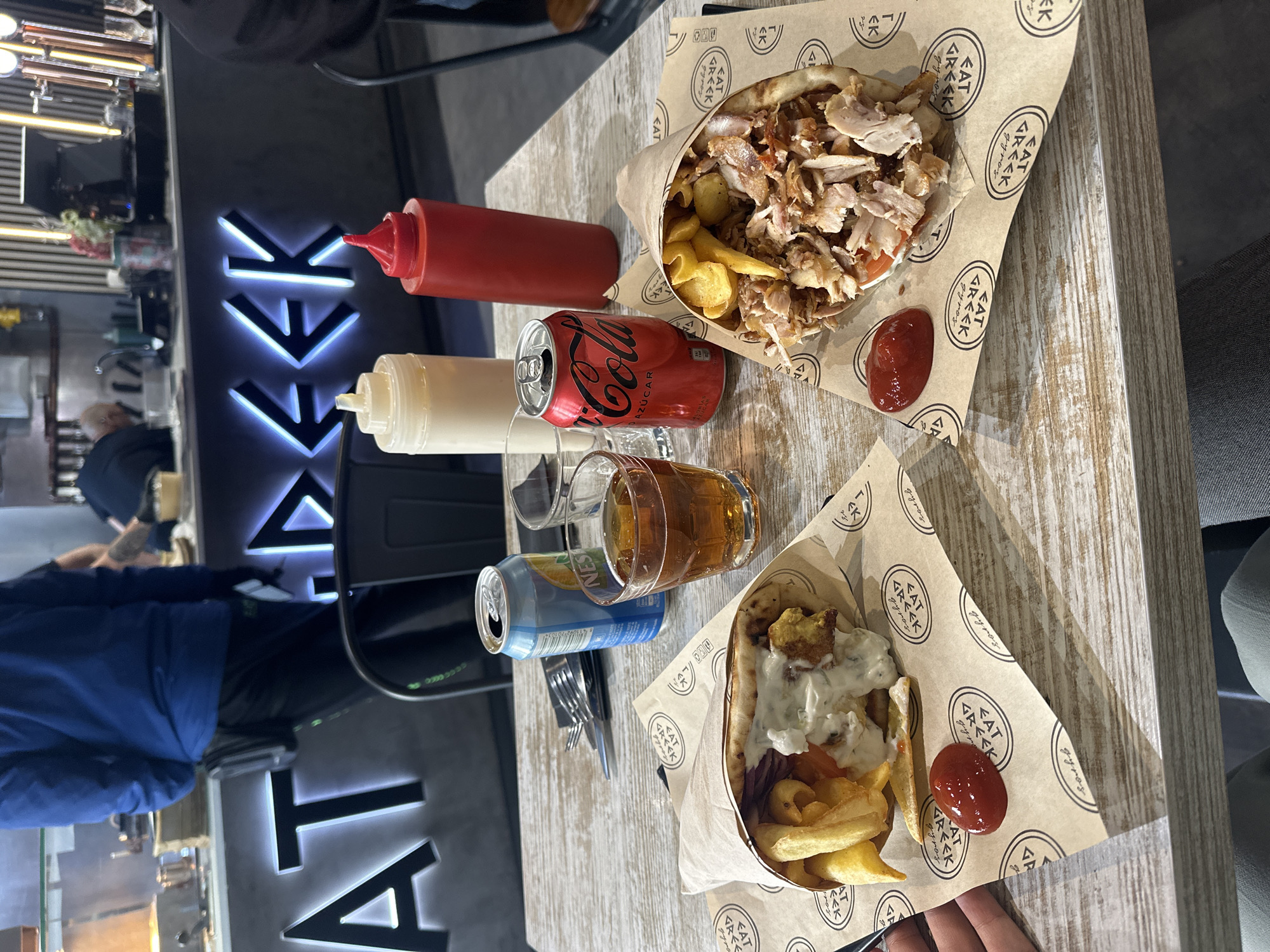 - "tabletop scene at a restaurant, likely in Alicante, Spain, based on the prominent "EAT GREEK gyros soulh" logo seen on the paper wrapping of the food" by FM-YNn2D2, licensed under CC BY 4.0