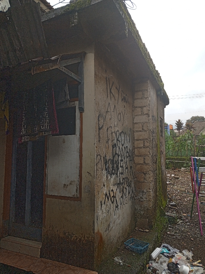 This image depicts an exterior view of a single-story building located in Keo Kouang, Laos, under an overcast sky. The building's walls are light brown/beige, showing significant staining, dirt accumulation, and black graffiti, which includes discernible names and words such as "IKY," "AJAY," "FERDI," "BAMBANG," "PULSA," and "MACRY." The corner of the building features exposed brickwork. The concrete roof overhang and sections of the wall, particularly near the base and on the right side, are covered in thick green moss. On the left side of the structure, a recessed doorway with a reddish-brown tiled step leads into a shadowed interior. Above the doorway, an open window frame displays hanging dark-colored, patterned fabrics, and a simple wooden awning extends horizontally over it. The ground immediately in front of the building is uneven dirt and gravel. A small blue plastic basket rests on the ground near the wall, adjacent to a concentrated pile of assorted trash, including plastic bags and foam containers. To the right of the building, a structure composed of thin, vertically oriented poles, colored blue, pink, and green, is present. Beyond this, the background reveals an area of green vegetation, possibly a garden or cultivated land, followed by other residential rooftops and trees under the bright, diffused light of an overcast sky. No individuals are visible in the scene.