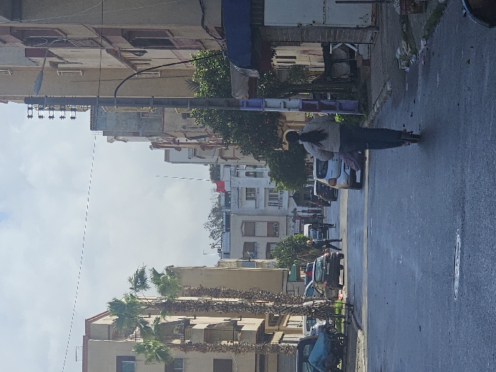 The image captures an urban street scene in Salé, Morocco, under a partly cloudy sky