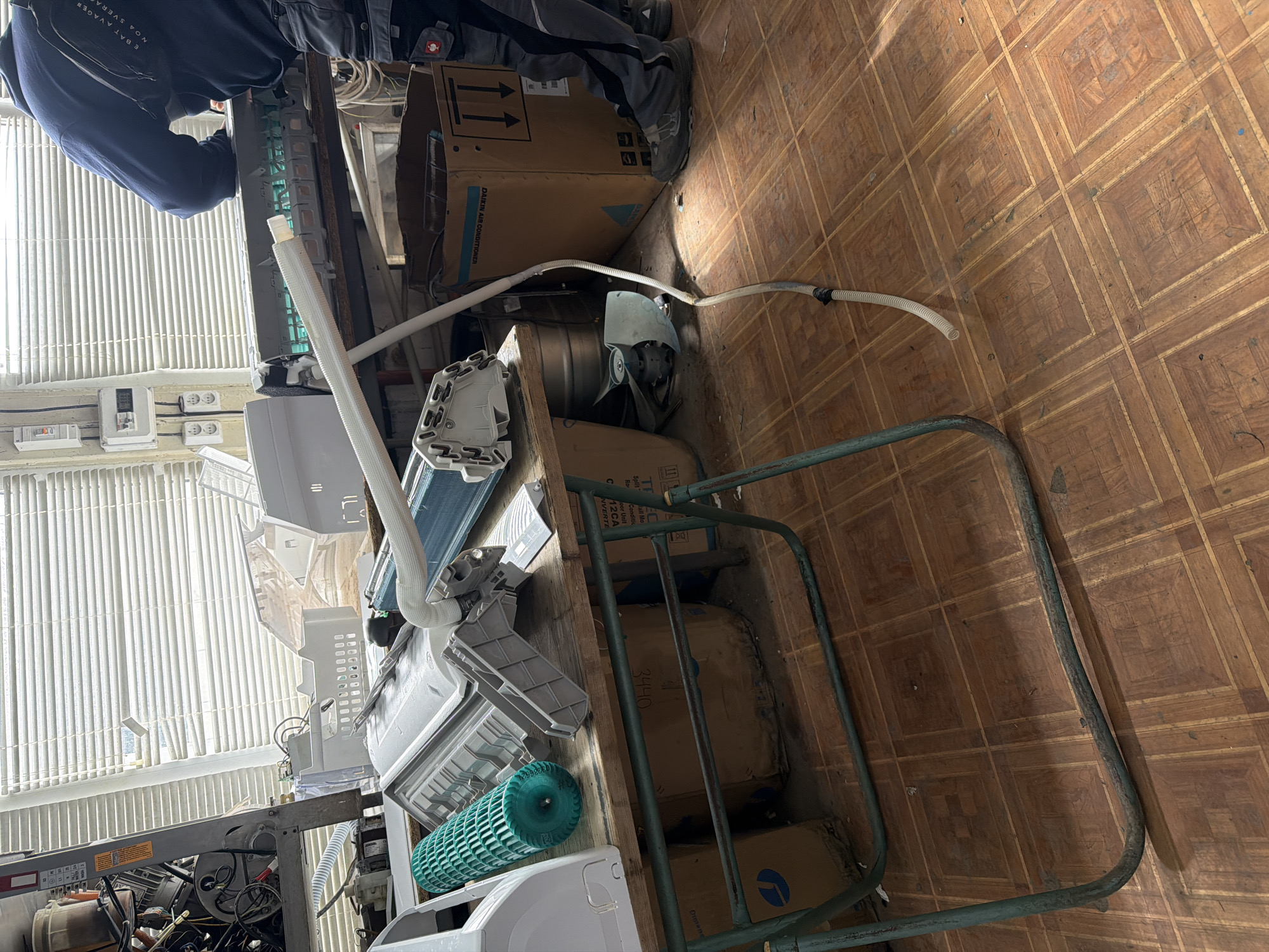 The scene depicts an indoor workshop or service area, located in Kavarna, Bulgaria, characterized by an ongoing air conditioning unit repair operation. A single individual, observed from behind, wears a dark blue hooded top and grey work trousers, leaning over a wooden workbench. The workbench is cluttered with disassembled components of air conditioning units, including a prominent green cylindrical blower fan, multiple white and grey plastic casing segments, and a blue-finned heat exchanger coil. A white, corrugated flexible drainage pipe extends from the workbench toward the floor. The floor is covered with brown and tan square-patterned linoleum. Beneath and around the workbench, several cardboard boxes are visible, one explicitly marked "DAIKIN AIR CONDITIONER". The background features a large window fitted with horizontal white blinds. To the far left, a metal rack holds various electrical components and wiring, while wall-mounted electrical outlets and circuit breakers are visible on the adjacent wall.