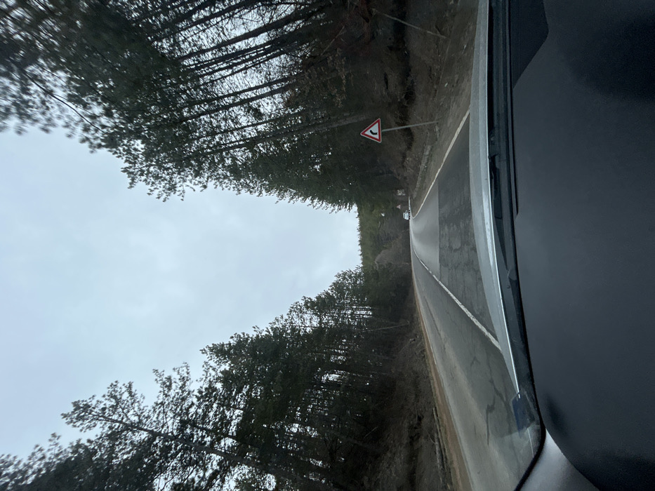 The image depicts a rural road scene in Sarantsi, Bulgaria, viewed from inside a vehicle through its windshield, with a portion of the dashboard and wipers visible at the bottom. The asphalt road, showing signs of wear, extends forward and curves gently to the right in the mid-distance. It features a solid white line on the right shoulder and a dashed white center line. Dense, tall evergreen trees, primarily pines, line both sides of the road, forming a forest canopy that frames the overcast, light gray sky above. On the right side of the road, a white triangular warning sign with a red border and a black right-curving arrow indicates an upcoming bend. Further down the road, a white passenger vehicle is discernible. On the left side of the road, near the tree line, what appear to be fallen logs or cut wood are present. No individuals are visible.