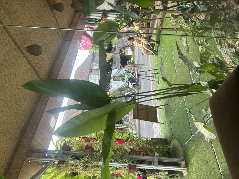 The image depicts a street-level view captured from inside a building through a large glass window, looking out onto a commercial area in Ubud, Indonesia, specifically adjacent to a business identified by a prominent pink semi-circular sign reading "SAPA SPA." In the immediate foreground, within the interior space, large-leafed green plants, including a central plant with prominent broad leaves, are visible. Other potted plants, some with variegated leaves and hanging vines, are arranged on a metal shelving unit to the left. The ceiling above the window is constructed from woven bamboo or rattan, featuring two dark wicker pendant lights. The exterior area directly outside the window is surfaced with artificial green turf, segmented by lighter-colored lines or strips. Two adult females, both wearing tan-colored uniforms, are seated on a wooden bench positioned on the right side of this turf area, appearing to be at rest. To their left, a dark A-frame sign stands on the turf, alongside a dark metal stool with a round wooden top. Behind the stool, a display object featuring braided hair is discernible. A white and red flag is partially visible behind the wooden bench. Beyond the turf area, a paved two-lane street is visible. A white scooter is either parked or in motion on the street, operated by an individual wearing a green helmet and jacket, consistent with a ride-hailing service. Additional motorcycles are partially visible further down the street. Across the street, traditional buildings with dark tiled roofs are visible amidst lush green foliage. The sky appears overcast.