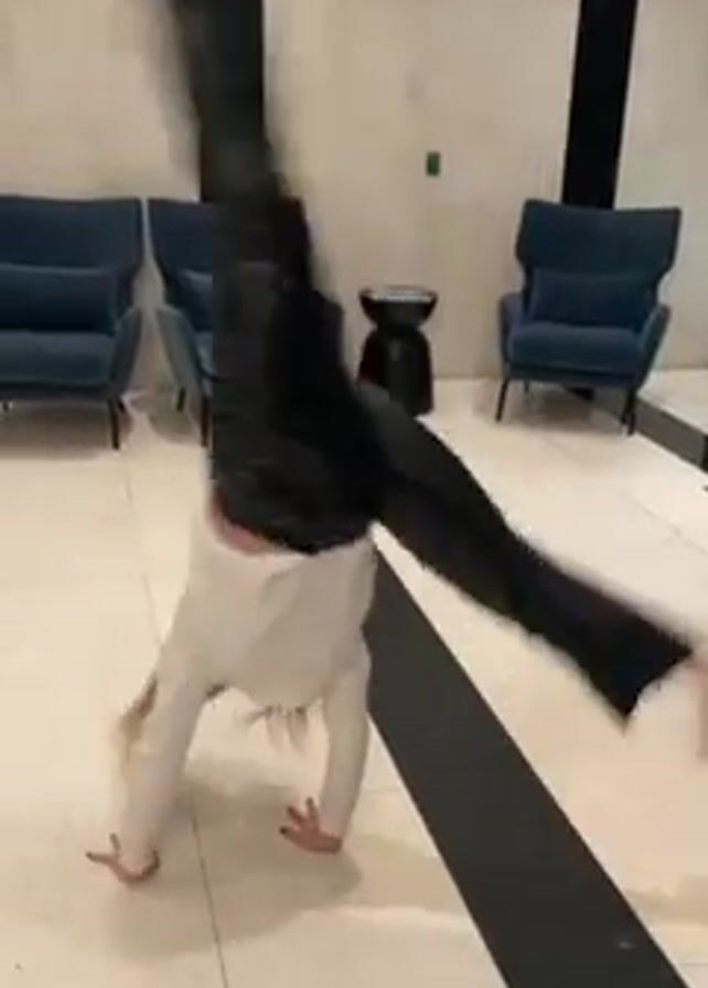 A woman performs a cartwheel on a tile floor in front of three blue chairs and small black tables