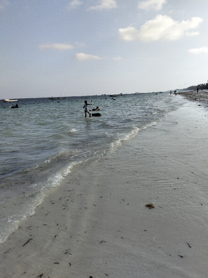 A wide beach scene under a bright, slightly overcast sky. The beach is light-colored sand with scattered debris. Waves gently lap the shore. Several boats are visible in the distance on the water. In the mid-ground, a person stands in the water near an inner tube with another person inside. Other people are scattered along the distant shoreline, with a few figures more distinct on the far right.
