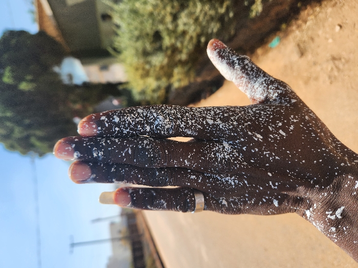 A dark-skinned human left hand, fingers slightly splayed and palm facing forward, is the central subject against a blurred outdoor background in Jos, Nigeria. The hand is extensively splattered with a white, particulate substance, consistent with paint, coating the skin and fingernails. A silver-toned band ring is present on the left ring finger. The fingernail of the index finger is noticeably longer and appears lighter in color than the others. The background reveals an unpaved, light-brown road on the left with distant utility poles and structures. On the right, blurred green foliage and a building with a light-colored roof are visible. The scene is illuminated by bright natural daylight under a clear blue sky.