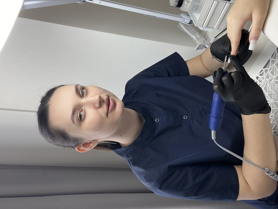 A female nail technician, located in the city of Tyumen, Russia, is depicted performing a nail service in an indoor professional setting
