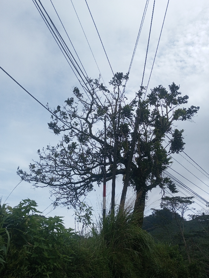 The image displays an outdoor scene in Thanthirimale, Sri Lanka, characterized by dense vegetation and overhead utility infrastructure under an overcast sky. Numerous dark cables, consistent with electrical or communication lines, crisscross the upper half of the frame, originating from multiple directions and appearing to converge towards the right side. A large, prominent tree with a thick, dark trunk and substantial branches dominates the mid-ground, exhibiting a mix of dense green foliage and areas with sparse leaves. To the left of this main tree, a slender utility pole with distinctive horizontal red and white stripes is visible. The lower portion of the image is filled with lush green foreground vegetation, consisting of various broad-leafed plants and tall grasses that obscure the ground. In the background to the right, a densely forested hillside is present under the cloudy sky. No individuals, animals, or specific activities are depicted.