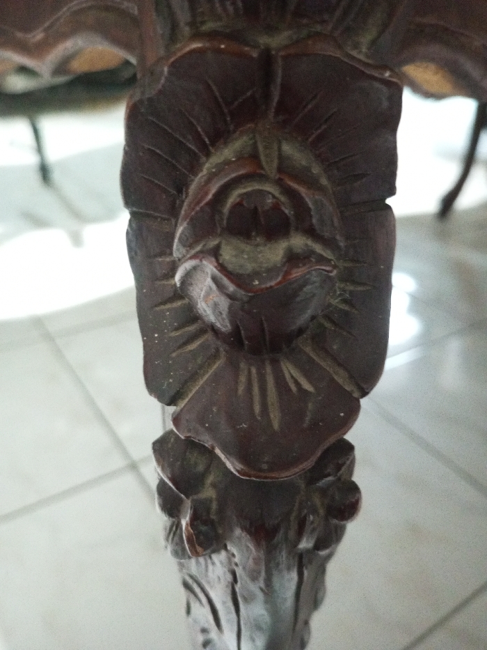 A close-up shows a dark brown, intricately carved wooden table leg