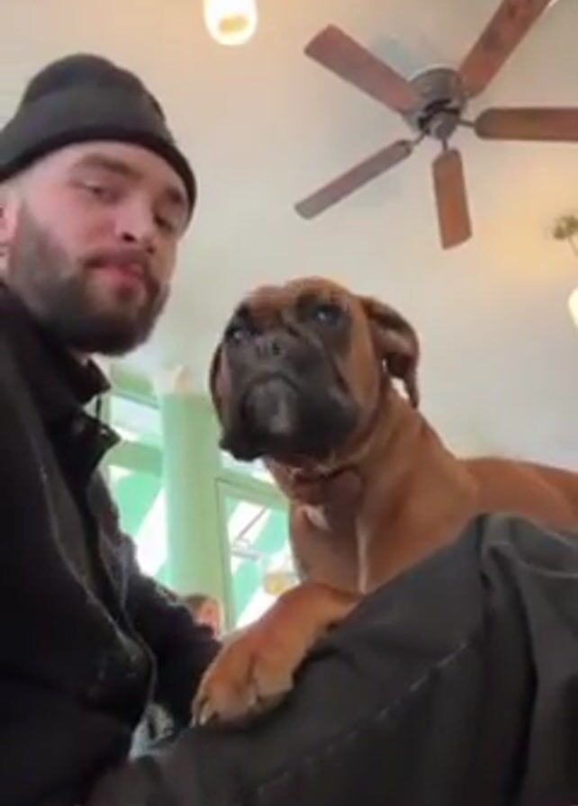A man wearing a black beanie and a black jacket sits down, and a brown Boxer dog has his paws resting on the man’s lap. The man smiles at the dog, and the dog puts his head against the man’s. The man kisses the dog on the head, and the dog kisses the man on the lips. A ceiling fan and several lights hang from the ceiling. A person is seated at a table in the background.