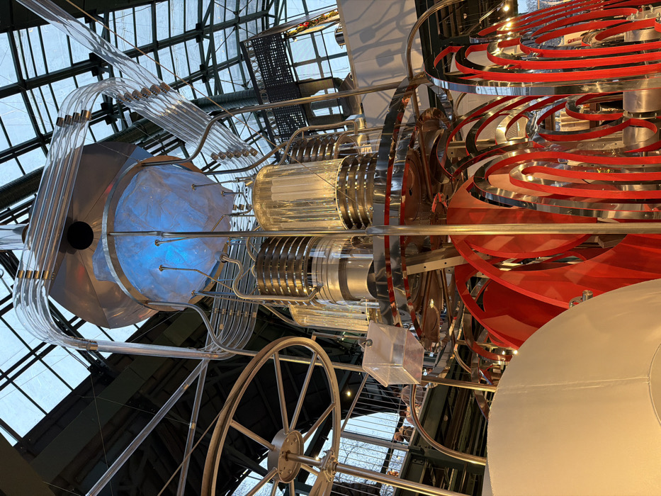 This image depicts a detailed section of a large, elaborate kinetic sculpture known as the "Mechanical Tree" or "Crystal Tree," located within the main atrium of GUM (Main Universal Store) on Red Square in Moscow, Russia. The sculpture, a complex assembly of polished metal, clear tubes, and illuminated elements, extends vertically towards a vaulted, multi-paneled glass roof structure, which is visible across the top of the frame, allowing ambient light to pass through. Prominently featured at the upper-center is an irregularly shaped, translucent object, emitting a distinct blue glow. Emanating from this upper section are multiple clear, curved tubes, forming intricate arcs across the upper portion of the sculpture. Below this, several vertical, cylindrical structures, made of clear material, enclose internal ribbed metallic components that are internally illuminated with a warmer light. The lower section of the sculpture incorporates numerous large, curved, and spiraling elements in a vibrant red color, interspersed with reflective silver components. Partially visible on the lower-left are large, white, curved surfaces. The primary materials appear to be stainless steel or chrome-plated metal, clear acrylic or glass for the tubing and cylinders, and either painted metal or colored plastic for the red elements. The scene is well-lit by a combination of natural light filtering through the glass roof and artificial illumination from within the sculpture itself, creating numerous reflections on its polished surfaces. In the blurred background, on an elevated walkway or balcony to the left, several indistinct human figures are visible, observing the installation. Their small size relative to the sculpture provides a sense of the artwork's substantial scale within the multi-level retail environment.