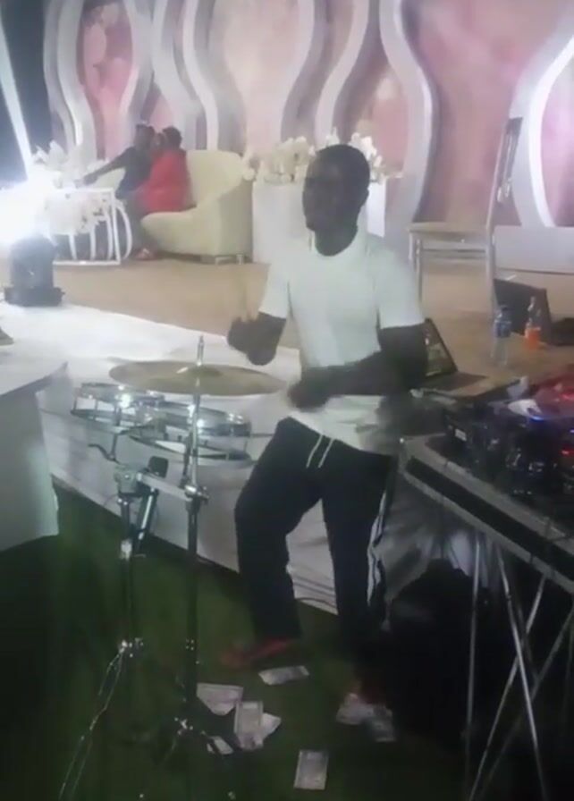 man playing a small drum set with cymbals at an event. He is wearing a white t-shirt and black sweatpants. Money is scattered on the green carpet at his feet. Behind him to the right is a DJ setup on a metal table. A DJ, wearing a black shirt, stands behind the table with a laptop and DJ equipment. Two people are sitting in a cushioned chair in the background. The room is decorated with white and pink accents, including large decorative panels.