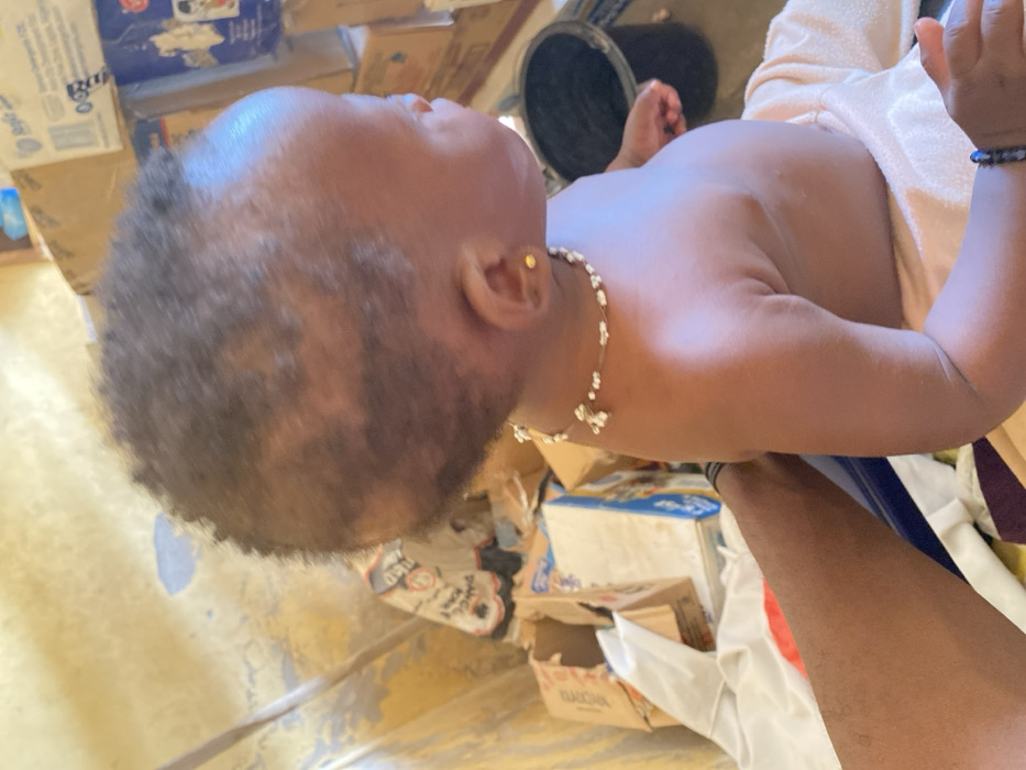 An infant lies on their back in the arms of a person. The baby wears a necklace and a stud earring. The baby's skin is brown. There is packaging and clutter in the background and on the floor. The baby is wearing a diaper.