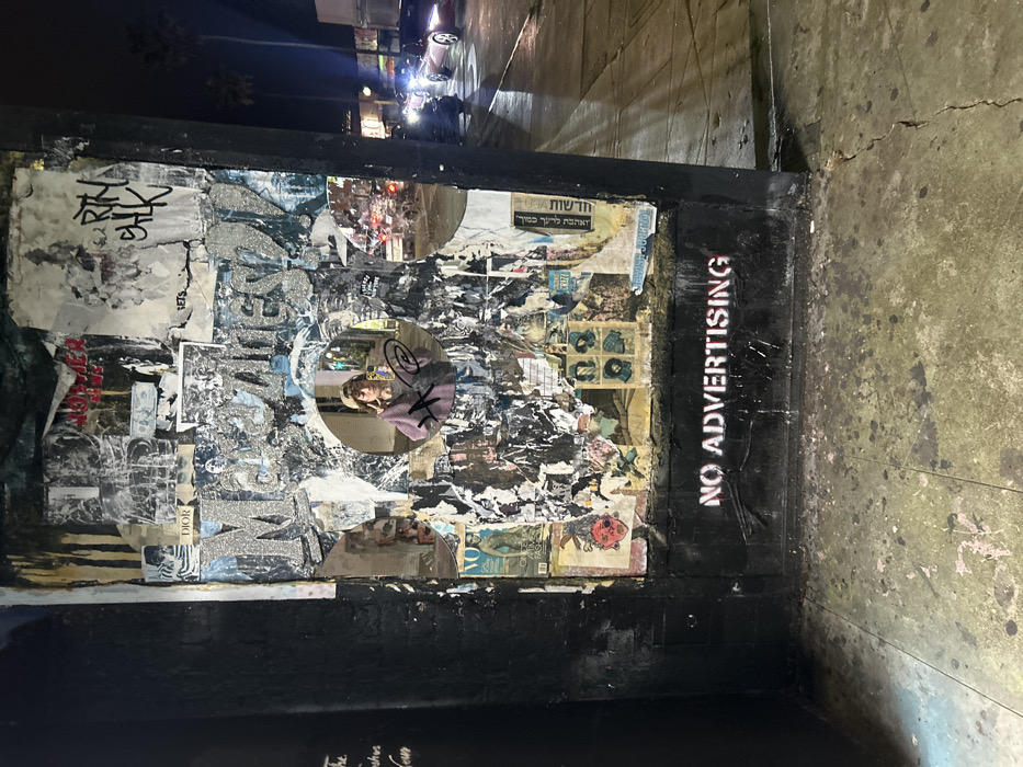A black wall section is covered in layered posters and stickers, some torn or peeling. A round mirror reflects a person taking a selfie. To the right, "NO ADVERTISING" is stenciled in white on black. The ground is concrete with cracks and stains. In the background, a blurred street scene at night shows cars and lights.