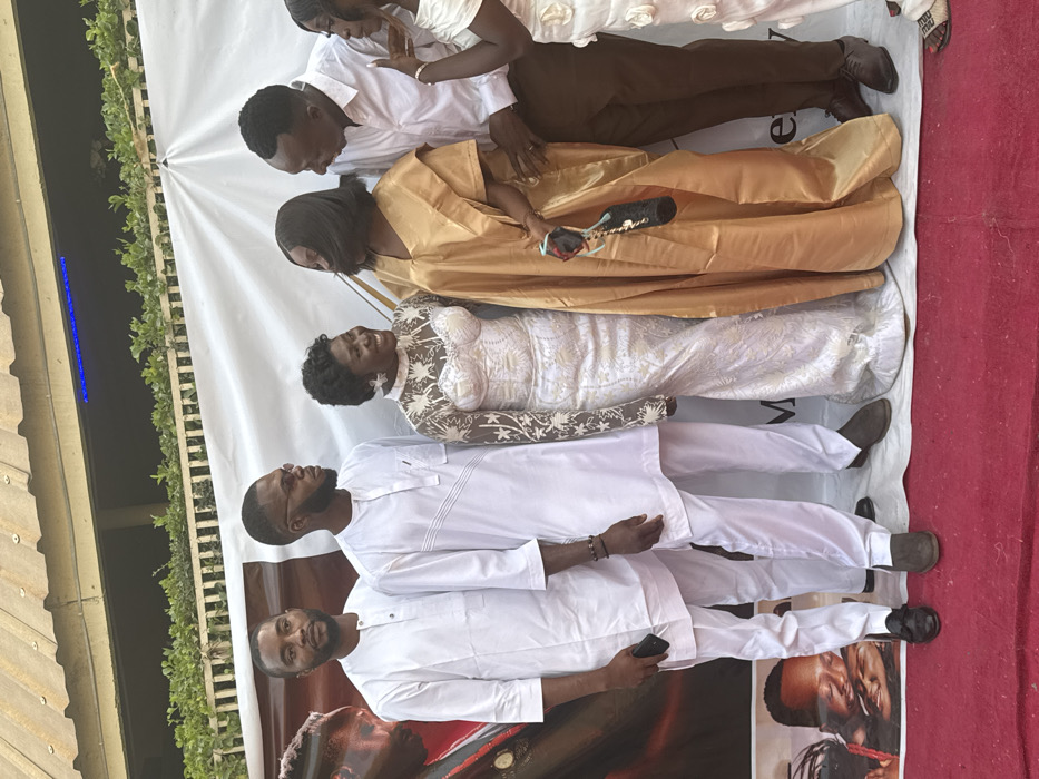The image depicts a group of seven individuals posing for a photograph on a red carpet against a white banner. The setting appears to be an event, possibly outdoors or in an open-air venue. In the background, a corrugated roof, foliage on a railing, and blue string lights are visible. From left to right: 1. A man is partially visible on the far left, dressed in dark attire. 2. A man stands in a white, collared, short-sleeved tunic and white trousers, holding a black smartphone in his left hand, looking towards the right. His shoes are black loafers. 3. Another man stands next to him, wearing a similar white tunic with diagonal stitching, white trousers, and sunglasses. He has a dark bracelet on his left wrist and is looking towards the right. His shoes are brown. 4. A woman wears a long, fitted white dress with a high neckline and long sleeves featuring elaborate lace and sequin detailing. She has short, dark, curly hair and large white floral earrings, smiling broadly and looking towards the right. 5. A woman stands in a loose-fitting, golden-colored traditional dress (bubu style). Her face is partially obscured by hair, but she appears to be smiling and looking towards the right. She holds a dark-colored bottle adorned with a red rose and ribbons in her left hand. A ring is visible on her right ring finger. 6. A man stands to her right, wearing a white long-sleeved collared shirt and brown trousers. He has his right arm around the waist of the woman in the golden dress, smiling and looking at her. A ring is visible on his left ring finger. His shoes are dark brown. 7. A woman is partially visible on the far right, wearing a light-colored, off-shoulder dress with floral appliqué details. Her left arm is visible, and she wears a ring on her left ring finger. Her feet are partially visible, wearing white sandals. The banner behind the individuals displays partial text, including "M" and "ery," and features a large, partially visible image of a man on the left, with another image of a couple visible further down. The specific location within the city of Jos, Nigeria, is not identifiable from the visual information provided in the image.