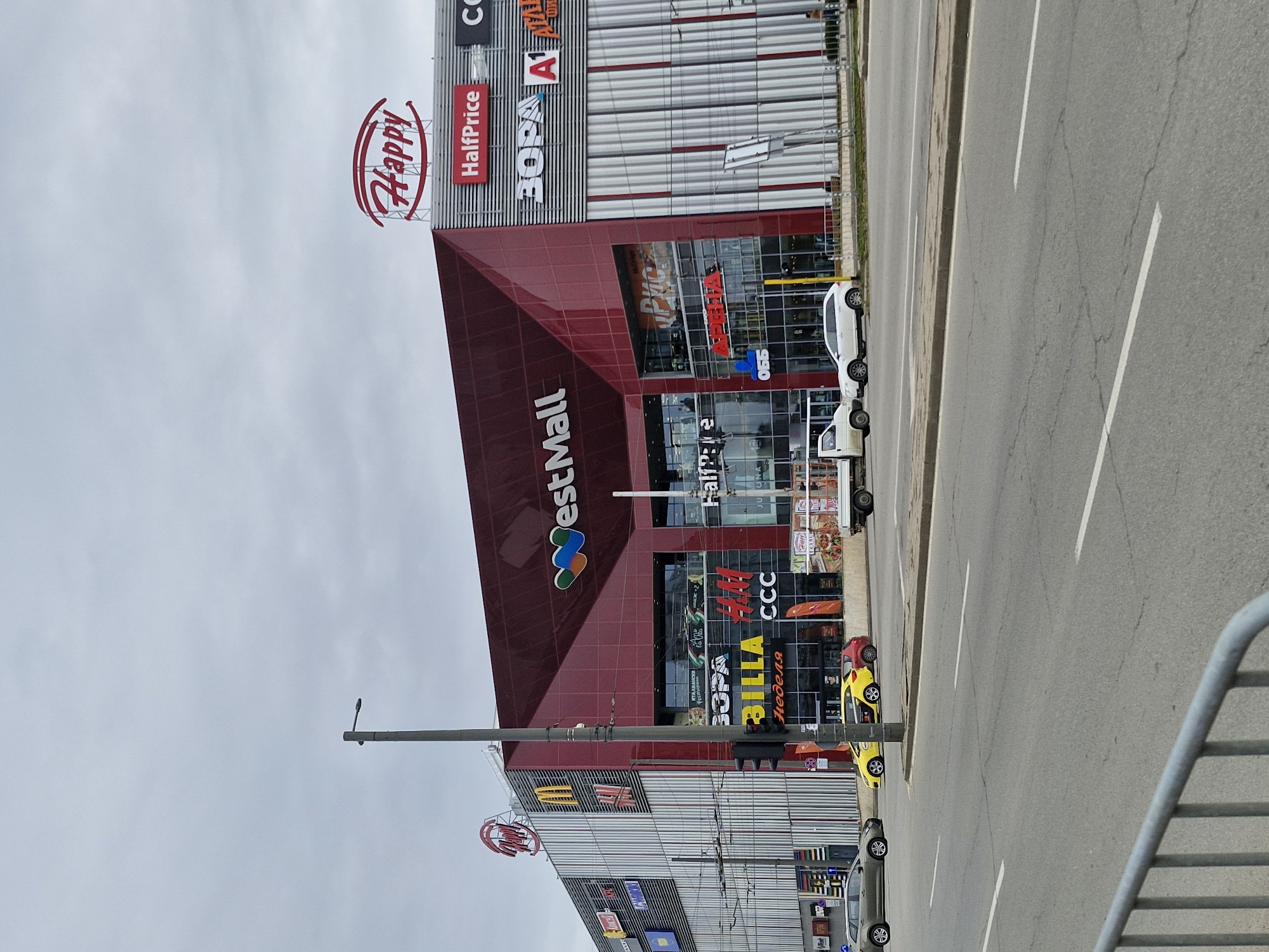 West Mall in Sofia, Bulgaria. The shopping center has several visible brand logos, including Happy, HalfPrice, Zopa, BILLA, CCC, and McDonald's. A road runs alongside the building with a few cars parked on the side. The sky is overcast.