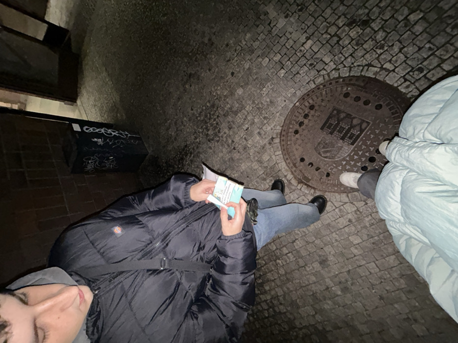 The image captures a dimly lit urban scene, likely at night or within a shadowed architectural space, in the Capital City of Prague, Czechia. Two individuals are present, observed from a high-angle perspective. One person, positioned on the left, wears a dark puffer jacket over a grey hooded sweatshirt, blue jeans, and black shoes. This individual's upper torso and face are visible as they look downwards, holding several papers and a small light-blue object in their hands, appearing to examine them. A black strap from a bag crosses their chest. The second individual, whose perspective the image appears to be taken from, is only visible from the mid-torso downwards, wearing a light blue puffer jacket and light-colored shoes. Their feet are positioned directly over a circular, metallic manhole cover. This manhole cover features the coat of arms of the City of Prague and the inscription "HL. M. PRAHA" (Hlavní město Praha), identifying the specific location. The ground consists of cobblestone paving, which appears damp in areas. In the background, to the left, a brick wall is visible, against which rests a dark, square trash receptacle covered in white graffiti tags. To the right, a dark recessed area or doorway is visible, suggesting an architectural opening or passage. No direct interaction between the two individuals is evident, but both are oriented towards the foreground objects.