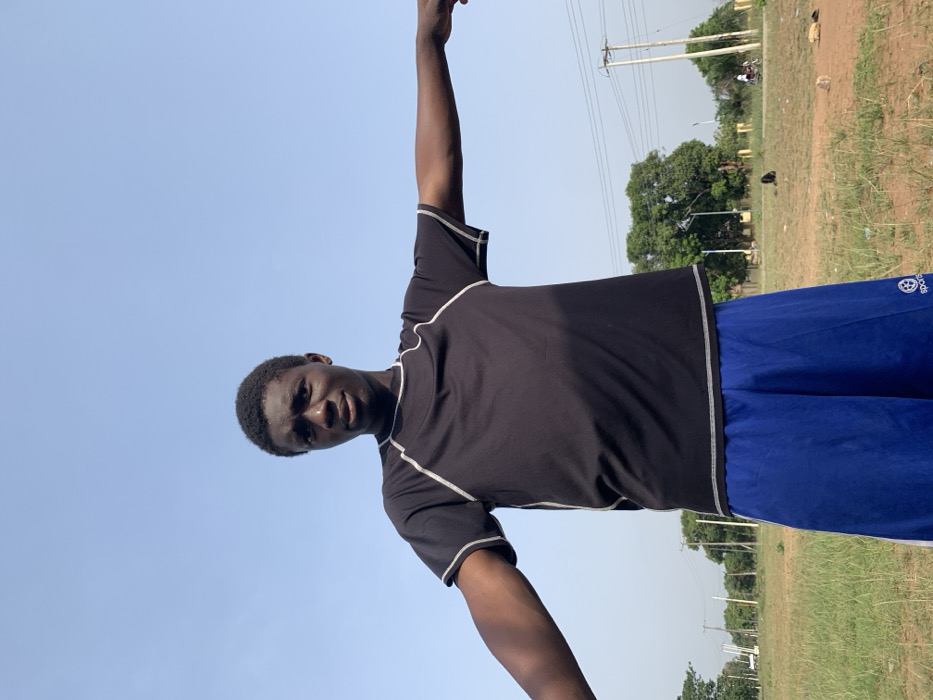 A young Black male is centered in the frame, standing outdoors in a grassy, undeveloped area within the city of Ihiagwa, Nigeria