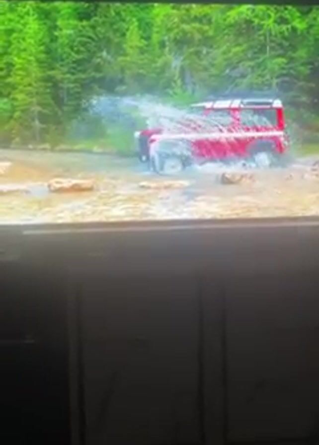 A red Land Rover is driving through a stream or river, kicking up water. The stream is shallow with some rocks showing. The background is a dense green forest. The video is playing on a TV, which is placed on a dark wooden cabinet with two doors. The video is slightly distorted due to being filmed off a TV screen.