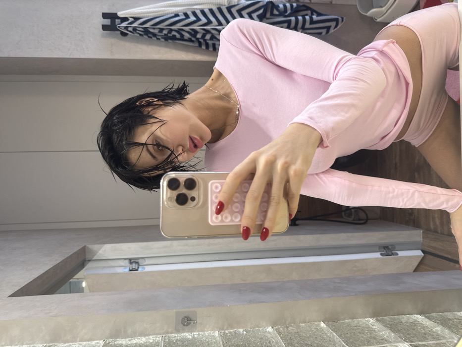 The image displays a female individual taking a mirror selfie within a bathroom setting, located in the city of Khimki, Russia. The subject has short, dark, wet hair, appearing to be styled in a bob or pixie cut, with strands falling across her forehead and face. She possesses prominent lips and defined eyebrows. She is dressed in a light pink, long-sleeved top that reveals a portion of her midriff, accompanied by matching light pink shorts. A thin necklace with a small pendant is visible around her neck. Her left hand, featuring red polished nails, holds a gold-colored smartphone, which appears to be an iPhone model with three visible camera lenses, encased in a clear cover. A light pink phone grip with multiple circular bumps is attached to the back of the phone case. The background consists of a modern bathroom with light-toned, textured wall tiles on the left and a plain light-grey wall surface. To the right, a dark wall-mounted hook holds a blue and white striped towel and a plain white towel. A small, clear adhesive hook is affixed to the tiled wall on the left. In the lower right corner, a white object, possibly a child's step stool or toilet training seat, rests on a red floor mat.