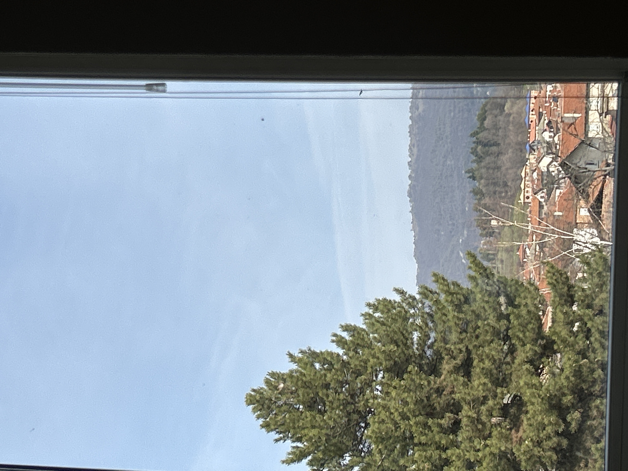 The image displays an outdoor scene captured through a window, providing a panoramic view of the city of Strelcha, Bulgaria. The upper third of the frame shows a clear, light blue sky with minimal cloud cover. A large, dark green conifer tree dominates the left side of the mid-ground, extending from the bottom edge of the frame to approximately two-thirds of its height. Below the horizon line of the tree and extending towards the right, the scene reveals a residential area characterized by numerous buildings with distinctive terracotta-tiled roofs. Interspersed among these structures are several bare deciduous trees and some green foliage. In the distant background, rolling hills or low mountains are visible, covered with a mix of light green and brownish vegetation. The view is framed by a white window sill at the bottom and a partial white window frame on the right side. A vertical cord or string, likely part of a window blind mechanism, is visible along the right edge of the window frame. Several small, dark specks, consistent with dust or debris on the window glass, are present across the sky portion of the image.
