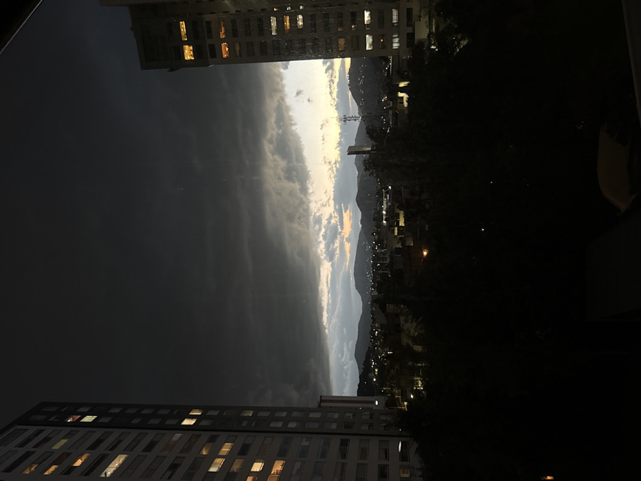The image depicts an urban cityscape in Interlomas, Mexico, at dusk or night, viewed from an elevated perspective, likely a building. The sky is largely obscured by dense, dark gray storm clouds, with a thin strip of lighter sky showing faint orange and yellow hues at the horizon. Two multi-story buildings, potentially residential or commercial, frame the view; one on the left (lighter gray with numerous illuminated warm-toned windows) and one on the right (darker, with fewer illuminated windows, and visible streaks on its facade). In the mid-ground, a sprawling urban area extends, characterized by numerous scattered points of artificial light indicating buildings and streets. A distant mountain range is silhouetted against the horizon. The immediate foreground and lower mid-ground are dominated by dark, undifferentiated vegetation, likely trees, with minimal visibility due to low light. No people, specific actions, or interactions are discernible.