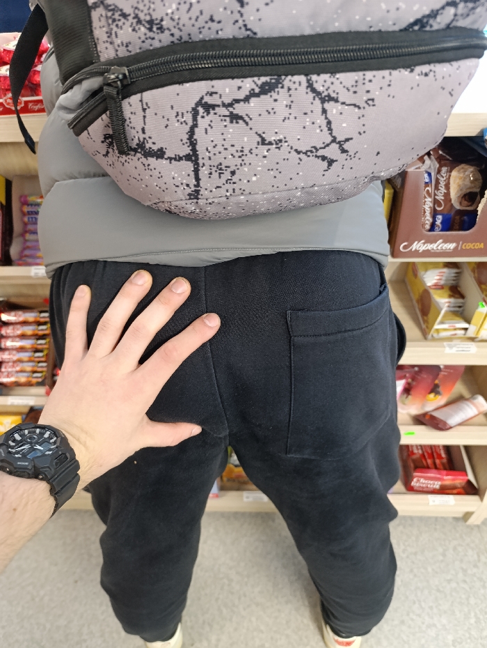 The image depicts an indoor scene within a retail establishment in Silistra, Bulgaria. A subject, observed from behind, wears a grey puffer vest, black sweatpants, and a grey fanny pack with a speckled grey and black pattern positioned on their lower back. The tips of light-colored footwear are visible. A second subject's left hand, adorned with a black digital wristwatch, is placed with fingers spread across the left gluteal area of the first subject. The background features retail shelving units, appearing to be constructed of light wood or laminate, stocked with various packaged goods, including confectionery items such as "Napoleon" branded chocolates and "Cheeto biscuits." The flooring is light-colored, consistent with linoleum or tile.