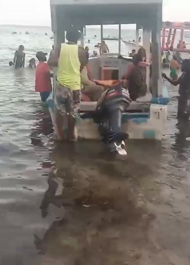 People wade in shallow water surrounding a small boat with an outboard motor near a beach crowded with other people. Several individuals are seated in the boat. One man, wearing a yellow tank top and camouflage shorts, stands on the boat's edge. Another person in dark clothing is reaching out from the boat towards someone in the water. The boat has a simple roof structure with open sides. A second, larger boat is visible further out in the water. The water is murky, and the sky is overcast.