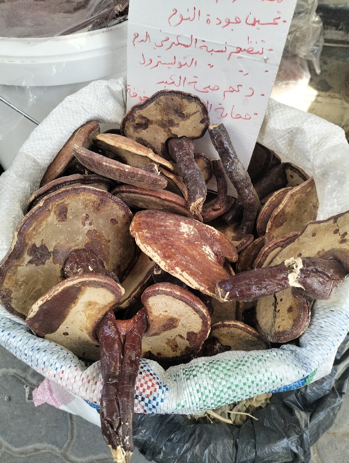 - "The image displays a close-up view of dried Ganoderma lucidum (Reishi) mushrooms contained within a white woven polypropylene sack" by FM-4RDN43, licensed under CC BY 4.0