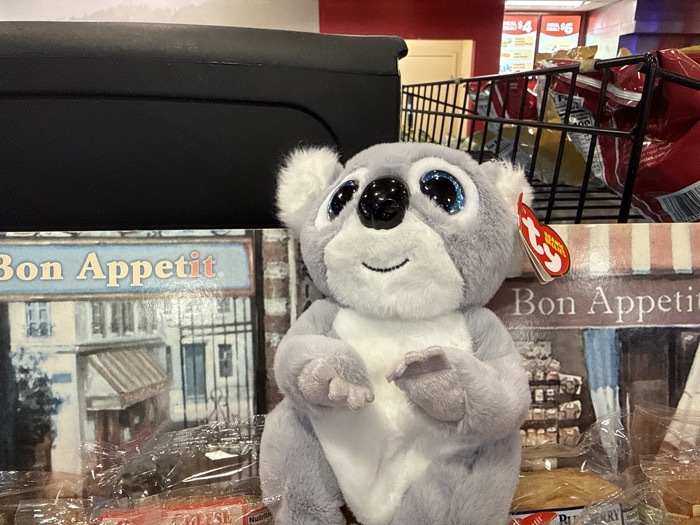 The image depicts a static scene within a retail establishment, specifically a convenience store or gas station mart, located in San Antonio, United States of America. The primary subject is a gray and white plush koala toy, approximately 8-10 inches tall, featuring large, glittery blue eyes, a black nose, and a small smile. A red "Ty" brand tag is visible attached to its right ear. The koala is positioned centrally in front of two display signs or boxes, each emblazoned with the text "Bon Appetit" above an illustration of a European-style building with an awning. Below the koala and the "Bon Appetit" displays, several plastic-wrapped food items, including what appears to be a blueberry-flavored pastry, are partially visible. To the right of the koala, a black wire display rack is filled with various bags of snack food, predominantly red and yellow packaging. In the background, typical retail store elements are present, including red and off-white walls and a distant illuminated sign indicating pricing such as "2 for $4" and "$6." A dark, possibly black, counter or shelf is visible at the top of the frame. No human subjects are present, and no active interactions are occurring.