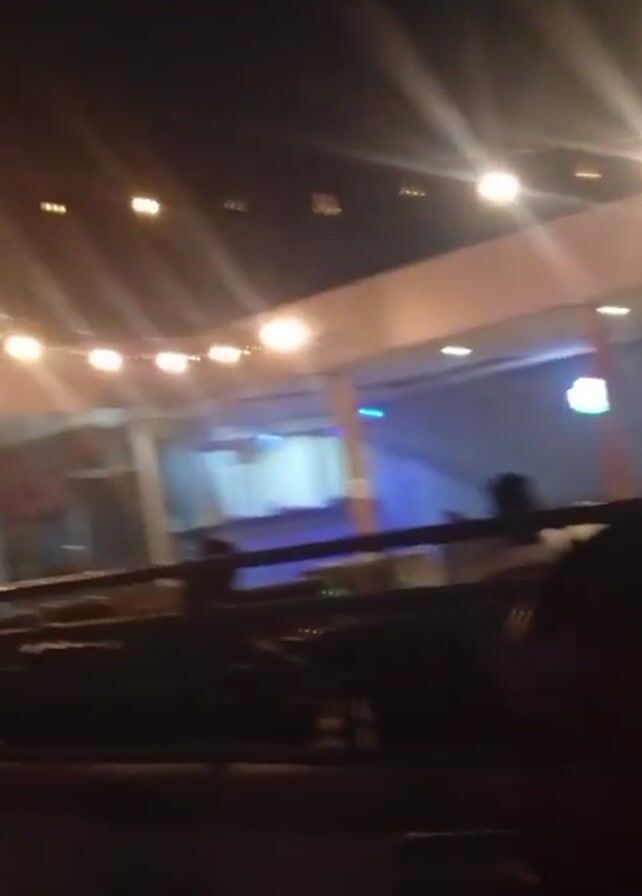 blurry, poorly lit outdoor scene at night. The camera is shaky and appears to be held by someone sitting. In the foreground is the back of a person's head. Behind them is a building with a row of lights along the roofline. There are also signs and artwork visible on the building's wall. The overall impression is of a nighttime gathering or event, but the lack of focus makes it difficult to discern details.