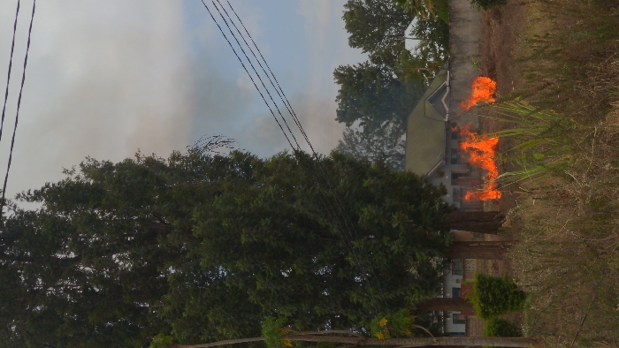 An outdoor scene in Longuo 'A', Tanzania, depicts a ground fire actively burning in dry vegetation within an open lot