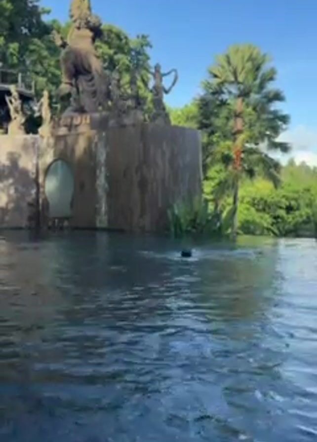 A medium shot shows a body of water, presumably a swimming pool, on a sunny day. In the background, there is a large stone structure with multiple statues atop it. A young person dives into the water and swims toward the camera. The water is blue and the surrounding vegetation is lush and green, creating a peaceful tropical setting.