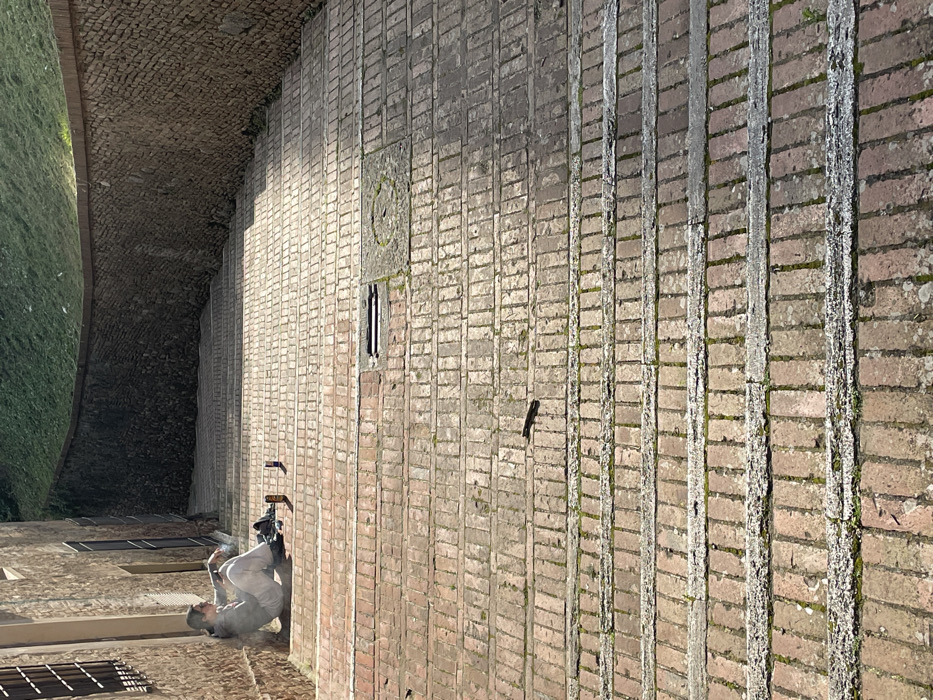 The image depicts a steep, wide set of weathered brick steps in the city of Siena, Italy. One individual, wearing light-colored athletic pants and a hooded top, is seated on the steps, leaning against a light-toned brick building wall on the left. The individual's right hand is near their mouth, with a wisp of smoke indicating the act of smoking. Two upright beverage cans, one metallic and one dark-colored, are positioned on the step to the right of the person's feet, next to a dark, indistinct object. The steps are constructed from reddish-brown bricks with visible mortar lines, exhibiting signs of wear and scattered moss or lichen growth. A darker, curved brick retaining wall ascends on the right side of the steps, with a bright green grassy slope visible beyond its upper edge. The scene is brightly illuminated by direct sunlight from the upper right, casting distinct shadows down the steps. Further down the brick staircase, a rectangular metal grate and a circular metal manhole cover, partially covered with moss, are embedded within the steps. A small, dark, elongated piece of debris rests on a step in the mid-ground.