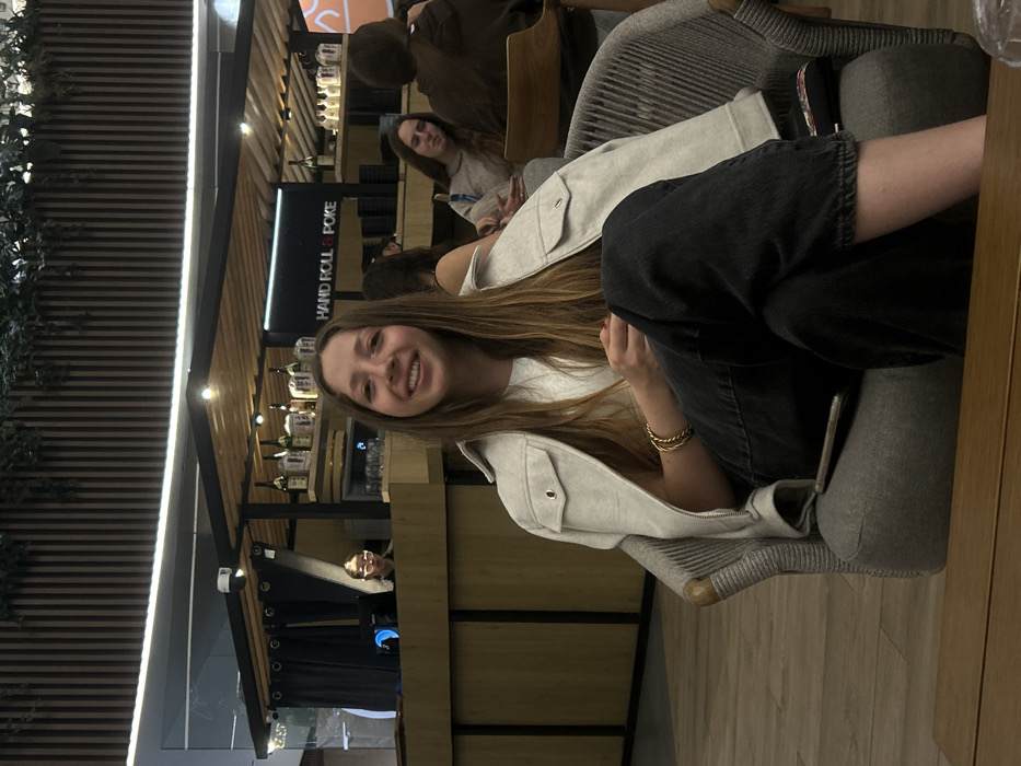 A young woman sits in a gray chair at a restaurant, smiling at the camera. She wears a white shirt and a light gray jacket. Her dark pants are rolled up, revealing her ankles. Behind her, other people are seated at tables, and the restaurant's bar area is visible. The space is illuminated by overhead lights, and there's a sign that says "Hand Roll & Poke." The restaurant has a modern, minimalist design with wood paneling.