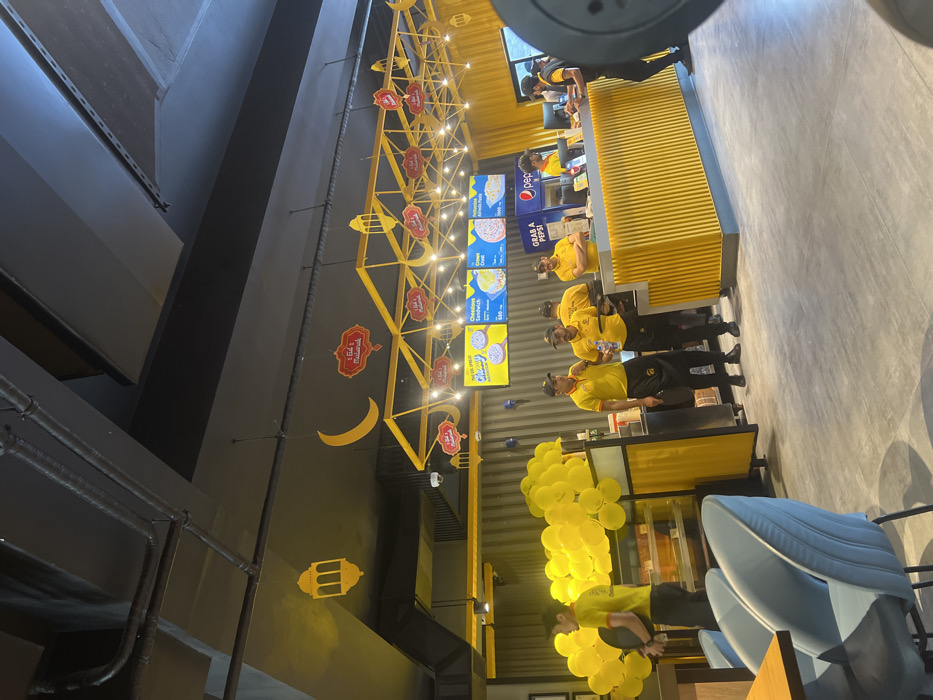 The image depicts the interior of a Cheezious fast-food restaurant located in Islamabad, Pakistan. The scene features a prominent yellow and dark gray color scheme. **Environment:** The establishment has an industrial-style ceiling with exposed dark gray utility pipes and ducting. Suspended from the ceiling is a yellow metal lattice structure adorned with string lights, yellow crescent moon cutouts, yellow lantern-shaped cutouts, and multiple red "Eid Mubarak" signs, indicating a festive occasion. The back wall features vertical yellow corrugated paneling. The floor is a light gray, possibly concrete or tiled. **Objects:** * A large, ribbed, bright yellow service counter runs across the middle ground, extending from left-center to right. * Above the counter, three digital menu boards display food items, including "Cheesilious Sandwich," "Cream Crust," and "Alfredo Pasta," with the "Cheezious" logo visible. * To the left of the counter, a large cluster of yellow balloons is arranged behind a glass display case, possibly containing pastries or other food items. * A Pepsi-branded soda dispenser is visible behind the counter on the right. * In the foreground on the left, partially obscured, are light blue upholstered chairs and wooden tabletops, indicating a dining area. * A black security camera is mounted on the ceiling on the left side. **People:** Approximately seven male staff members are visible, all wearing matching yellow polo shirts, dark pants, and dark aprons, indicative of a uniform. * One staff member on the far left is partially obscured, holding a dark circular serving tray. * Four staff members are positioned behind the main yellow counter, two facing towards the right, appearing to be in conversation or awaiting orders. * Two staff members are further right behind the counter; one is operating a point-of-sale (POS) system, while the other stands nearby. * Another staff member is partially visible behind the counter on the far right. **Actions/Interactions:** The staff members are standing and engaged in various activities consistent with restaurant operations, including carrying a tray, interacting with a POS system, and conversing among themselves. No customers are clearly visible interacting with staff in the immediate foreground, but the setup suggests customer service is ongoing or imminent.