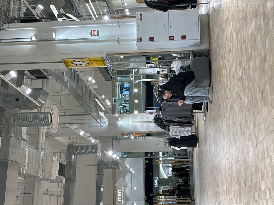 A woman in a black jacket and blue jeans sits on a gray upholstered bench in a retail store. She appears to be resting, with her head tilted slightly forward. Clothes racks filled with various garments surround her. The store has bright, overhead lighting and exposed ductwork. The "M&G" logo is visible, along with a sign indicating "men" in Russian. The floor is a light wood-grain pattern.