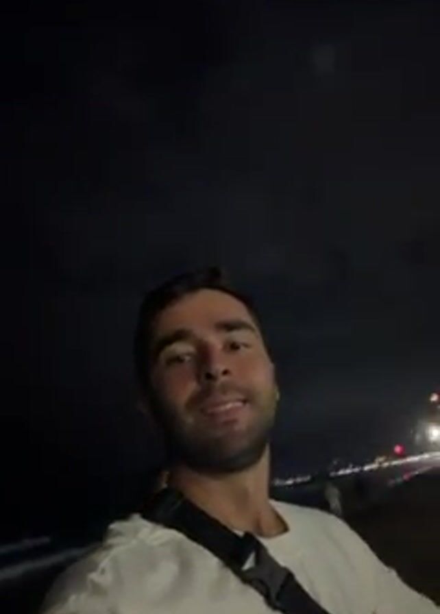 man and woman standing on a beach at night, facing the camera. The man is in the foreground, wearing a light-colored shirt and a black strap across his shoulder. The woman is behind him, slightly to the left. They are both looking at the camera, but their attention is drawn upward by fireworks going off in the sky. The sky is dark, and there are lights from buildings visible in the distance along the shoreline. The man smiles, is surprised, and makes an expressive face.