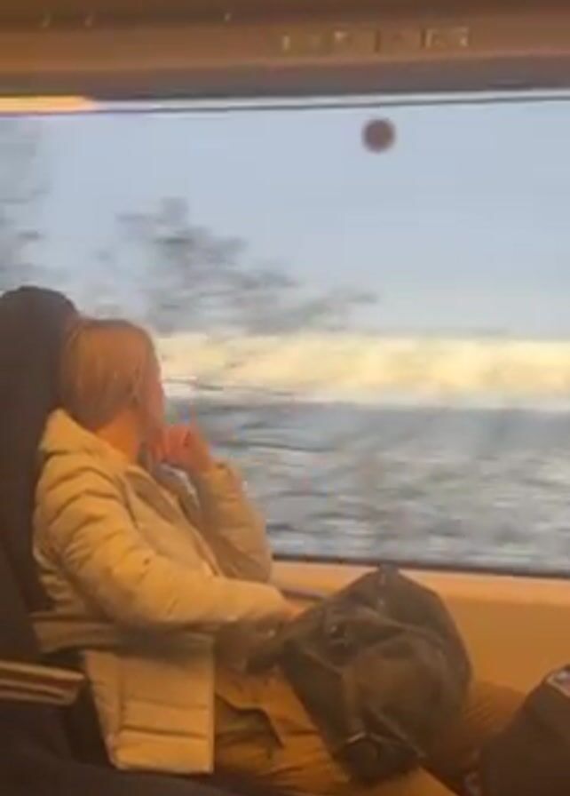 A woman sits on a train, gazing out the window at a body of water. She is wearing a light-colored puffy jacket and khaki pants, and has a dark bag next to her. Her hand is to her face. Outside the window, the scene is a body of water with a hazy horizon and cloudy sky. Bare trees are also visible passing by. The interior of the train is visible, including other passengers and signage. The scene is somewhat grainy.