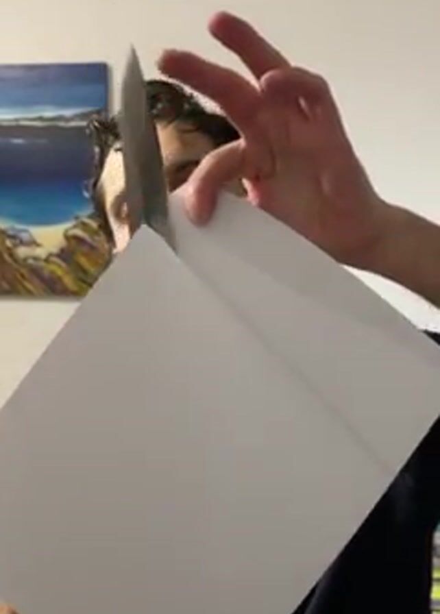 A man in a navy t-shirt is holding a large knife and a piece of white paper. He is looking directly at the camera as he cuts the paper with the knife. The paper tears easily and he holds up the two pieces to the camera. The background is a white wall with a painting of a landscape on it.