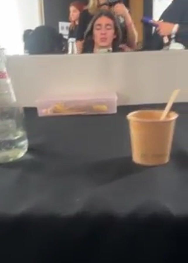 The video captures a scene behind the scenes, likely at a fashion event or photoshoot, reflected in a mirror. A person with long hair sits in front of the mirror, seemingly taking a selfie with a smartphone while two individuals style their hair with hairdryers. The person on the left has blonde hair and glasses, while the person on the right has dark curly hair and glasses. Another person with red hair is visible in the background, partially obscured. In the foreground, a black surface holds a clear glass bottle of water, a light pink plastic container with orange and yellow objects inside, and a light brown paper cup with a wooden stir stick inside. The background suggests an interior space with simple decoration and exposed structural elements.