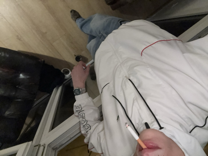 An individual is depicted indoors, standing on light-colored wooden floorboards. The exact location within the city of Saint-Denis, France, cannot be determined from the visual evidence. **People:** One person is partially visible from the chest down to the upper legs, and their lower face, including the lips. The person appears to be male. **Subjects/Actions:** The person is holding a lit cigarette with a visible glowing ember at the tip between their lips. Their left arm is angled downwards. **Objects:** The individual is wearing a white hooded jacket with black drawstrings and black trim along the zipper. The right sleeve displays the word "LACOSTE" in black vertical lettering. A thin red horizontal line is stitched on the lower left front of the jacket. A metallic wristwatch with a green face and a silver-toned band is on the left wrist. Light blue denim jeans are worn on the lower body. Dark footwear is partially visible on the left foot. In the background, a white-framed glass door or large window is visible, reflecting ambient light. A dark, possibly black, object, resembling an upholstered piece of furniture, is positioned next to the glass structure. Two small, circular, dark-colored objects, one possibly a cup or ashtray, are present on the floor near the person's right foot.